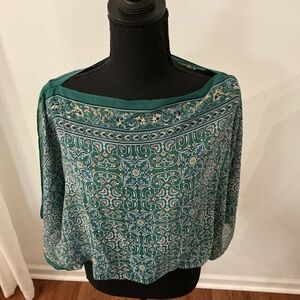 Chic teal blouse with intricate patterns. Flowy and stylish design. Ideal for versatile wear.