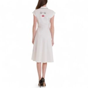 A crisp and elegant white fit-and-flare dress featuring a unique embroidered lady face design. Made with lightweight, stretchy fabric for comfort.
