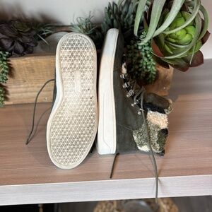 Suede Zip & Lace-up boots with camouflage faux fur lining. Green boot with white cushion heel. Lots of padding, very comfortable as well as fashionable.