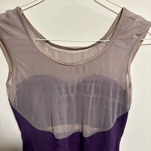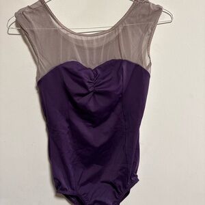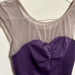 Elegant purple leotard featuring a sheer neckline and sleeveless design. Includes a bust panel. Comfortable and elegant.