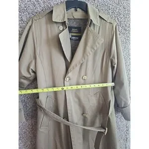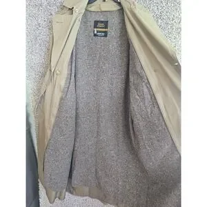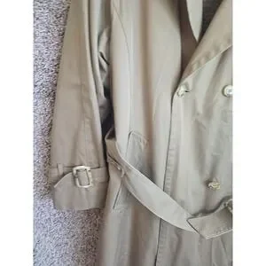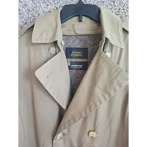 This vintage London Fog Tempo Europa trench coat in beige is a timeless addition to any wardrobe. With a double-breasted button closure and a belted waist, this mid-length coat is perfect for any occasion, whether it's for business, casual, or a party. The long sleeves and collared neckline add to its classic preppy style, while the solid pattern and wool material make it perfect for the fall and spring seasons.