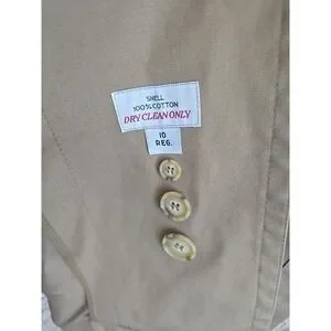 This coat is a size 10 regular fit and should be dry cleaned only. Its accents include buttons and a belted waist, making it a stylish and practical choice. This Tempo Europa trench coat is a must-have for any fashion-forward woman who wants to add a touch of vintage style to her wardrobe.