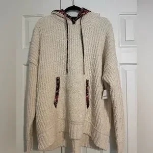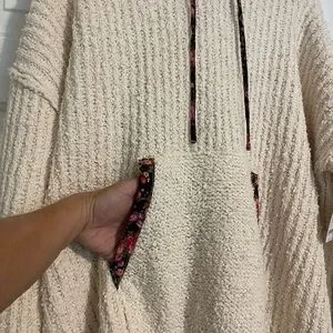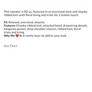 Features: Chunky ribbed knit, attached hood, drawstring details, kangaroo pocket, drop-shoulder sleeves, ribbed hem, floral trims and lining Why We