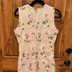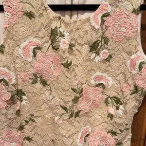 Chic mini dress with pink floral lace. Sleeveless and stylish.