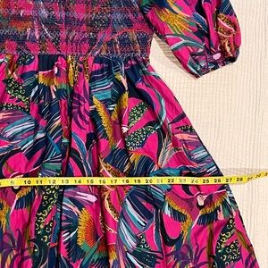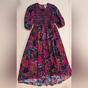 Farm Rio NWT Rainbow Macaws Purple Puff Sleeve Smocked Midi