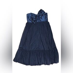 Step out in style with this elegant blue strapless dress. Perfect for any occasion, this dress features a stunning bow detail and a flowing skirt. Make a statement with its rich color and sophisticated design.