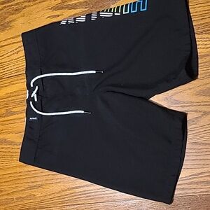 Black board shorts with a striking multicolor logo on the side. Features a comfortable fit and adjustable drawstring.