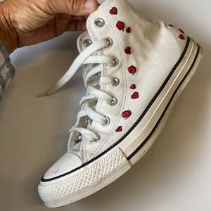Classic Converse high-tops in white. Features charming red heart & red roses accents. Ideal for everyday style. Excellent condition. Worn a few times. Perfect for Valentine's Day!