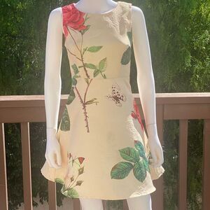 Work of art. Textured fabric with floral/butterfly motif. Back zipper closure. Lined. Fit and flare. Size Says medium but dress runs small. Excellent like new condition. I listed this as an XS.