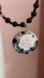 shimmering abalone reflects the light in this amazing black onyx art deco necklace. heavy round black onyx beads vary in sizes making an artistic pattern for glimmering abalone. carved white mother of pearl rose sits in a sea of silver and black. shiny 18KTGP white gold accents and toggle clasp.