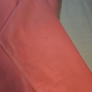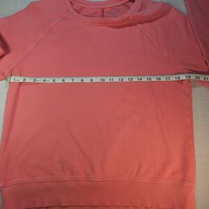 The Athleta Women's Peach Sundown Stretchy Sweatshirt in size Small is a cozy and comfortable pullover sweatshirt perfect for activewear or casual occasions. Made with a knit fabric blend of cotton (98%) and other materials, this sweatshirt features a crew neckline, long sleeves with raglan sleeves, and a relaxed fit. The peach color adds a pop of brightness to your wardrobe, while the easy care instructions make it convenient for everyday wear. With a chest size of 38 inches, this sweatshirt is a versatile addition to your collection, suitable for winter, fall, and spring seasons. There is a very small, faint stain on the left sleeve between wrist and elbow. See last photo