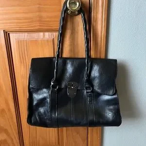 Elegant black leather satchel. Features a secure clasp and sturdy handles. Has some pen markings on lining inside. 2nd owner has normal wear. Lots of life left. Perfect for everyday use.