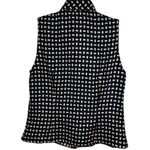 VTG Vintage Carlisle 100% Silk Secretary Bow Button Up Sleeveless Top Size 4. Abstract design looks like coffee beans, cute red stitching, in perfect like new condition. Super fast shipping from smoke free home. Reasonable offers always welcome. Approximate measurements: