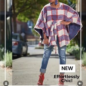 Stylish plaid cape/poncho with a belt. Features red, blue, and white colors. Perfect for a chic look. S/M 0-8