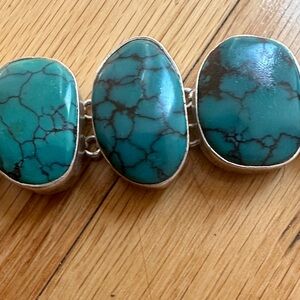 striking turquoise stones bracelet with silver. Perfect for adding a pop of color to any outfit. Purchased in Maui.