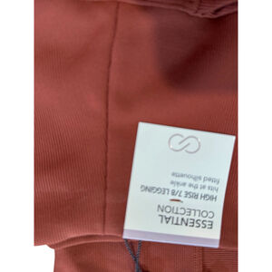 These are CALIA Women's Essential Ribbed 7/8 Leggings in Red Brown. They feature a high-rise fit, a ribbed texture, and side pockets. The material appears to be a blend, and the construction includes visible stitching details. The leggings are new with tags attached, indicating no signs of wear.