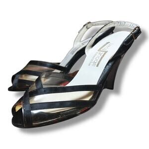 Keywords: vintage Mervyn’s, Mervyn’s heels, black gold sandals, retro heels, slingback heel, vintage dress shoes, size 6 heels