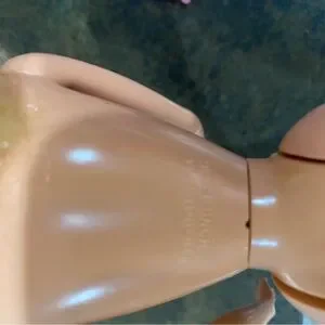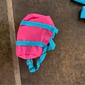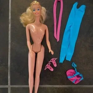 Barbie doll wearing a vibrant blue jumpsuit. Comes with pink headband and matching bag. Perfect for imaginative play. See photos for wear on clothing and accessories. Well loved Barbie from the 80s. Thanks for shopping with me!