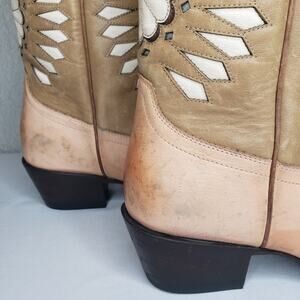 LIMITED Edition Tecovas by Kristopher Brock Sadie Leather Boots are a stylish and versatile pair of women's shoes in size 9.5. Featuring a pointed toe, low heel, and mid-calf shaft style, these rustic Western-inspired boots are perfect for a variety of occasions including travel, parties, and casual outings. Hand-painted with a floral pattern in a beige color, these limited edition boots offer comfort and are made of high-quality leather. The unique inlay and layered accents add a touch of flair to these fashionable and timeless boots. Boots have marks, stains , and scuffs showing a rustic finish on the leather.
