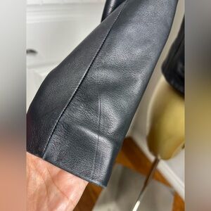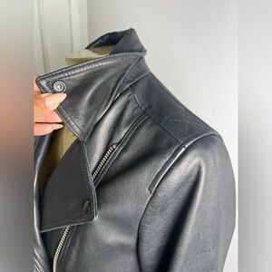 Chic leather jacket with a modern edge. Features sleek zippers and a tailored fit.