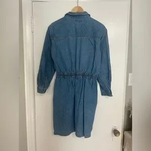 Chic long denim dress with button-up front. Features a belted waist and chest pockets. Ideal for layering.
