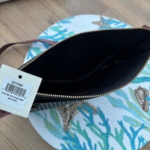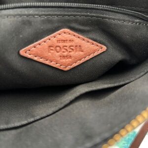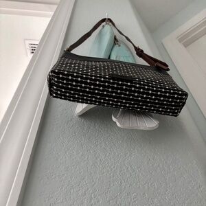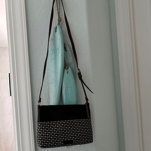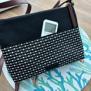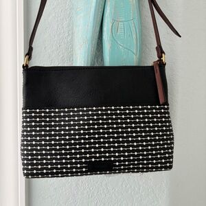 Great Fossil bag in black and white with gold trim. Upper section solid black. Bottom section textured black with white dotted stripes. Very nice subtle pattern. Two outside pockets and two inside pockets-one zippered; one slip. Adjustable strap. Never used.
