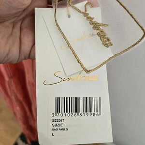 Sundress Suzie Crossover Front Maxi Dress Sao Paolo Coral Pink Metallic Rainbow Stripe, Size L. Dress is great for spring and summer! Features a halter neckline with front and back cutouts, tiered flowy skirt. Lightweight and airy fabric in a rich coral pink with metallic stripes in a rainbow of colors for the perfect amount of sparkle and shine. Cotton/metallic yarn fabric, lined through bust.