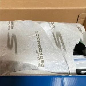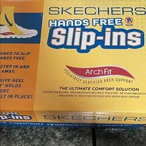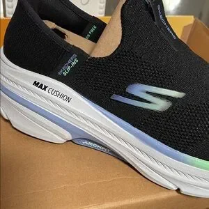 Skechers slip-ons with black upper and blue accents. Features Max Cushion for comfort.