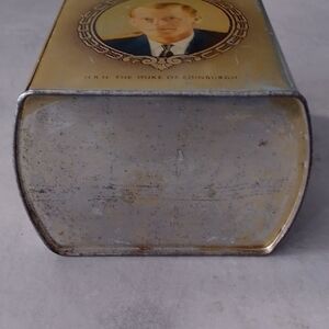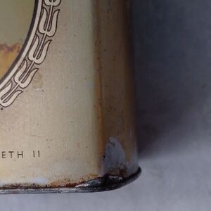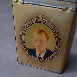 Charming vintage tin box featuring a portrait of a queen and the Duke of Edinburgh. Perfect for collectors.
