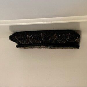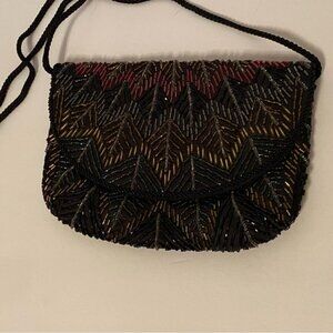 VINTAGE HANDMADE BAG CROSSBODY SHOULDER BEADED BLACK BROWN GOLD RED LONG STRAP
