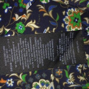 Add a pop of elegance to your wardrobe with this Tory Burch silk blouse in a charming ditsy floral print. Featuring rich navy, green, and ivory tones, this short sleeve top includes subtle pleating at the bust, a lightly structured silhouette, and a classic v-neckline. Perfect for work, brunch, or weekend styling.