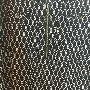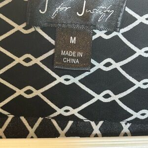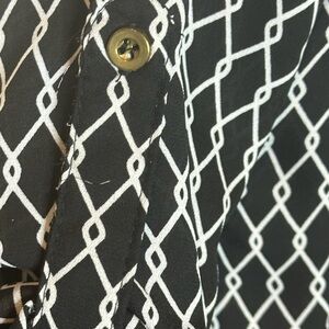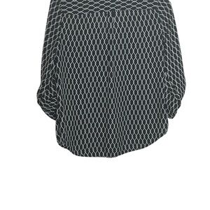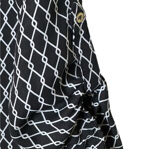 J FOR JUSTIFY BLACK AND WHITE GEOMETRIC PRINT SIZE M ROLL UP SLEEVES WITH TAB AND BUTTON PIT TO PIT 18” SHOULDER TO HEM 23” 3/4 ROLL UP SLEEVES WITH TAB AND BUTTON. SLEEVE LENGTH DOWN 20”