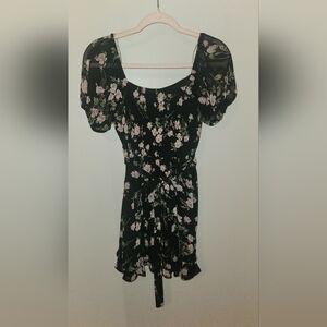 Chic mini dress with pink floral pattern. Features a square neckline and short sleeves.