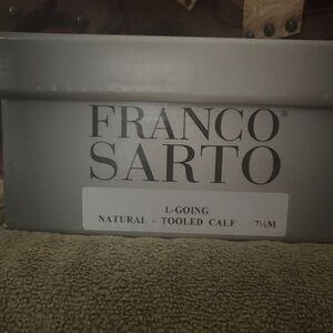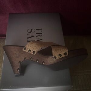 Elegant tan slides with embossed pattern. Ideal for everyday comfort. The bottoms are wood with nail head detailing, the uppers are embossed leather. These were worn once.
