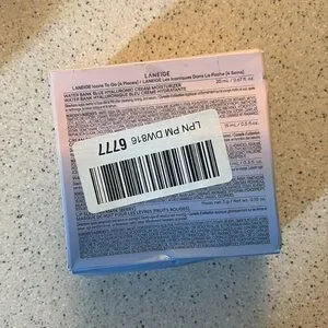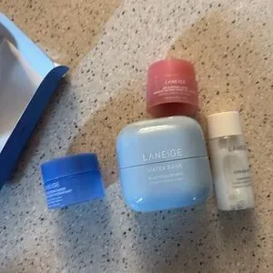 LANEIGE set includes blue cream, white toner, and pink lip mask. Ideal for on-the-go skincare.