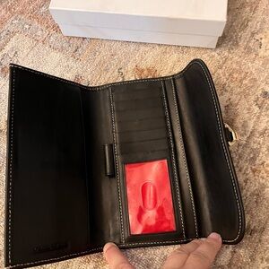 Elegant black wallet with monogram pattern. Features a secure clasp and classic design.