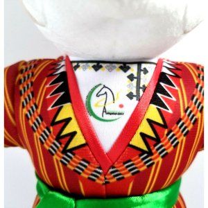 Adorable plush dog in multicolored ethnic attire by Malvina.