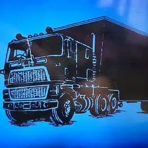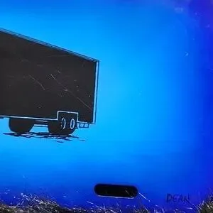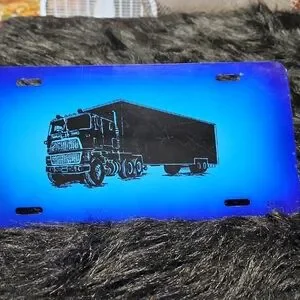 Decorative license plate with a black truck design on a blue background. Metal. Has name Dean lower corner.
