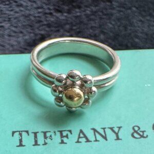 This is a vintage Tiffany & Co. Paloma Picasso Jolie ring. The flower has an 18K gold center, with 925 sterling silver petals and ring. It is size 6.5, and is in excellent condition. The box is not included.