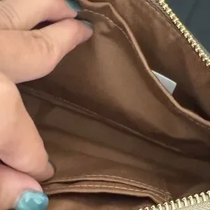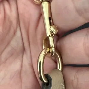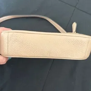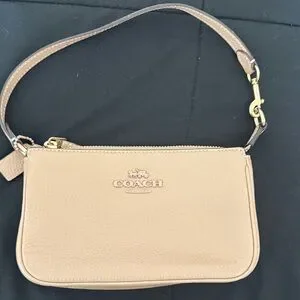 Chic Coach wristlet in beige leather. Features a sleek design with a secure zip closure. Ideal for on-the-go style.