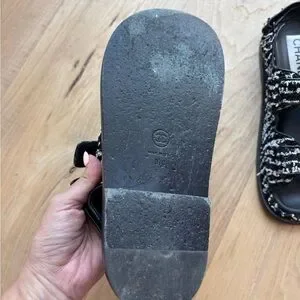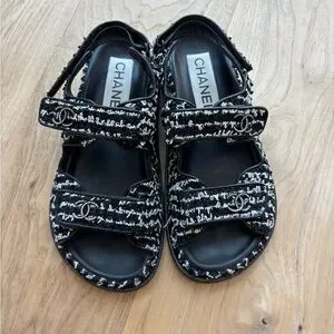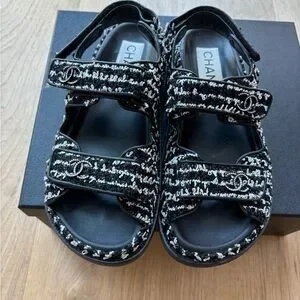 Super rare find! I haven’t seen the same pair anywhere. Elegant CHANEL dad sandals with black and white tweed design. Features iconic logo detail. Perfect for stylish outings. Only wore two times. Conditions 9.5/10. Comes with original dust bag and box. No lowball offers please.