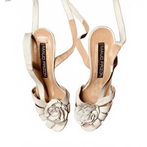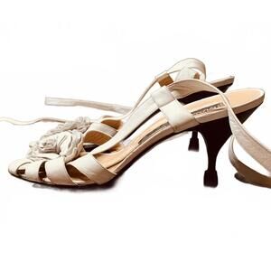 Maud Frizon Women's White Leather Floral Accent Ankle Wrap Heeled Sandals (L18)
