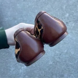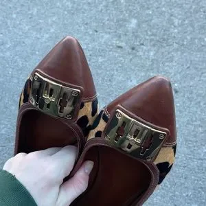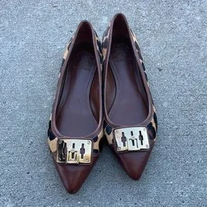 Stylish leopard print flats. Features gold accents. Perfect for any occasion.