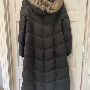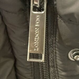 Down Parka puffer jacket by London fog features a faux fur lined hood. Hood is removable. Hits above the ankles. Button closure covers the zipper to ensure cold air stays out. Great Preowned condition. I bought it for one season of a Pennsylvania winter. Very warm! Sweatshirt cuffs at wrists. Made of down and feathers. See photo for details of fabrics and care. Pockets on each side.