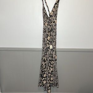 Elegant floral maxi dress. Features a black base with cream floral pattern. Sleeveless design with a flowing silhouette.