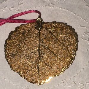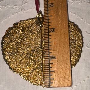 Elegant large gold leaf pendant with a pink ribbon. Perfect for adding a touch of nature-inspired beauty to any outfit.