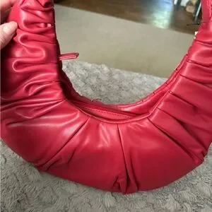 Stylish red hobo bag by Badgley Mischka. Features elegant ruching and a sleek design. Perfect for any occasion.