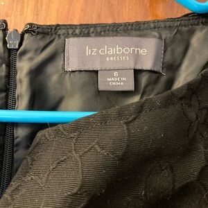 Little black dress by Liz Claiborne. Includes belt detail and notched neckline. Subtle floral print. Dress is lined. Good for all occasions, including professional situations.