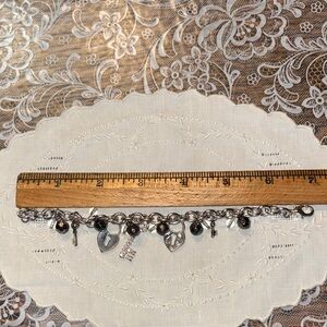 Elegant silver charm bracelet featuring black and silver accents. Perfect for adding a touch of sophistication to any outfit.