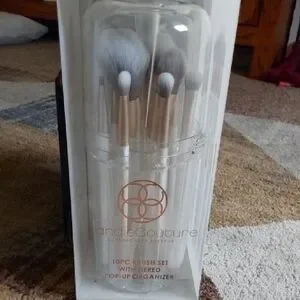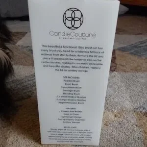 Candie Couture 10-piece makeup brush set with tiered pop-up organizer. Features elegant white and gold brushes.